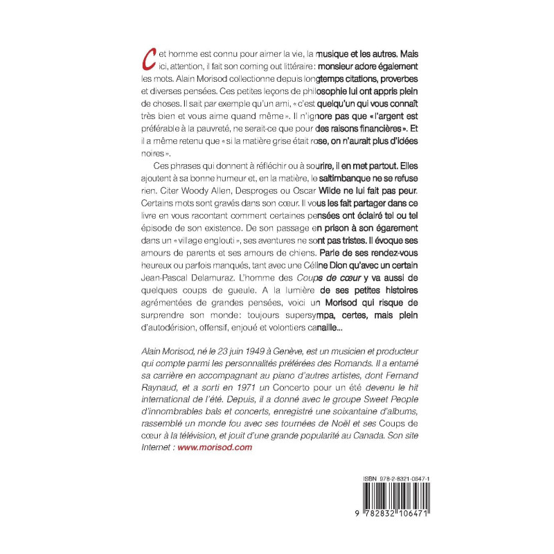 Ces phrases qui donnent à réfléchir ou à sourire, il en met partout. Elles ajoutent à sa bonne humeur et, en la matière, le saltimbanque ne se refuse rien. Citer Woody Allen, Desproges ou Oscar Wilde ne lui fait pas peur. Certains mots sont gravés dans son cœur. Il vous les fait partager dans ce livre en vous racontant comment certaines pensées ont éclairé tel ou tel épisode de son existence. De son passage en prison à son égarement dans un « village englouti », ses aventures ne sont pas tristes. Il évoque ses amours de parents et ses amours de chiens. Parle de ses rendez-vous heureux ou parfois manqués, tant avec une Céline Dion qu’avec un certain Jean-Pascal Delamuraz. L’homme des Coups de cœur y va aussi de quelques coups de gueule. A la lumière de ses petites histoires agrémentées de grandes pensées, voici un Morisod qui risque de surprendre son monde: toujours supersympa, certes, mais plein d’autodérision, offensif, enjoué et volontiers canaille…