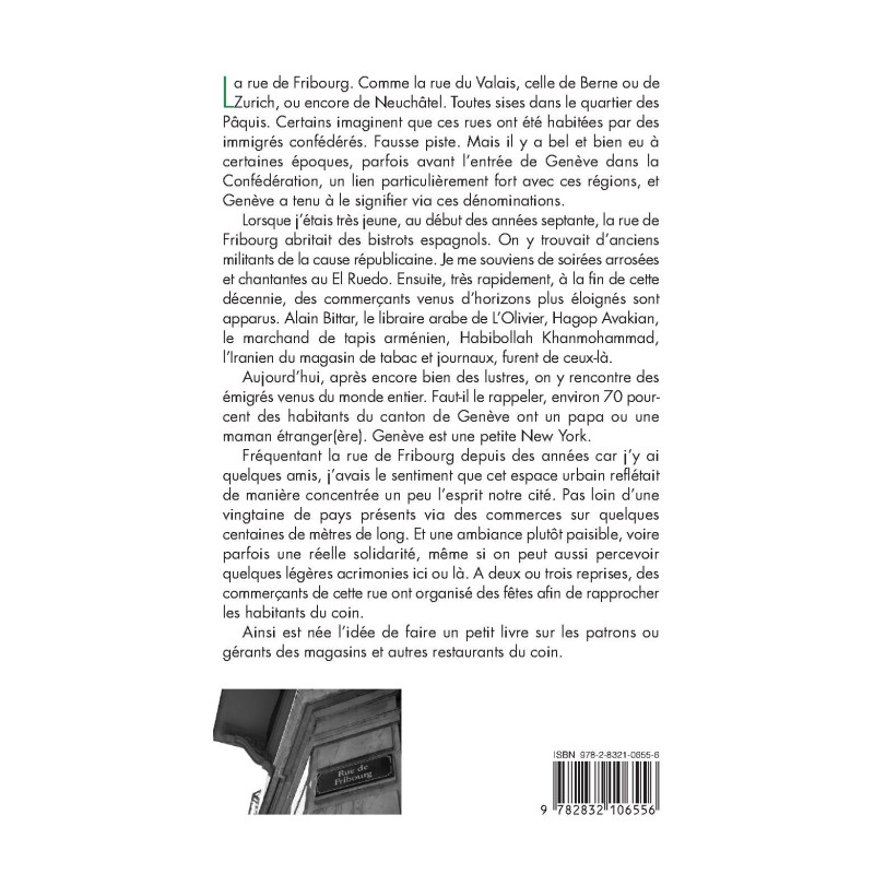 La rue de Fribourg. Comme la rue du Valais, celle de Berne ou de Zurich, ou encore de Neuchâtel. Toutes sises dans le quartier des Pâquis. Certains imaginent que ces rues ont été habitées par des immigrés confédérés. Fausse piste. Mais il y a bel et bien eu à certaines époques, parfois avant l’entrée de Genève dans la Confédération, un lien particulièrement fort avec ces régions, et Genève a tenu à le signifier via ces dénominations. Lorsque j’étais très jeune, au début des années septante, la rue de Fribourg abritait des bistrots espagnols. On y trouvait d’anciens militants de la cause républicaine. Je me souviens de soirées arrosées et chantantes au El Ruedo. Ensuite, très rapidement, à la fin de cette décennie, des commerçants venus d’horizons plus éloignés sont apparus. Alain Bittar, le libraire arabe de L’Olivier, Hagop Avakian, le marchand de tapis arménien, Habibollah Khanmohammad, l’Iranien du magasin de tabac et journaux, furent de ceux-là. Aujourd’hui, après encore bien des lustres, on y rencontre des émigrés venus du monde entier. Faut-il le rappeler, environ 70 pourcent des habitants du canton de Genève ont un papa ou une maman étranger(ère). Genève est une petite New York. Fréquentant la rue de Fribourg depuis des années car j’y ai quelques amis, j’avais le sentiment que cet espace urbain reflétait de manière concentrée un peu l’esprit notre cité. Pas loin d’une vingtaine de pays présents via des commerces sur quelques centaines de mètres de long. Et une ambiance plutôt paisible, voire parfois une réelle solidarité, même si on peut aussi percevoir quelques légères acrimonies ici ou là. A deux ou trois reprises, des commerçants de cette rue ont organisé des fêtes afin de rapprocher les habitants du coin. Ainsi est née l’idée de faire un petit livre sur les patrons ou gérants des magasins et autres restaurants du coin.