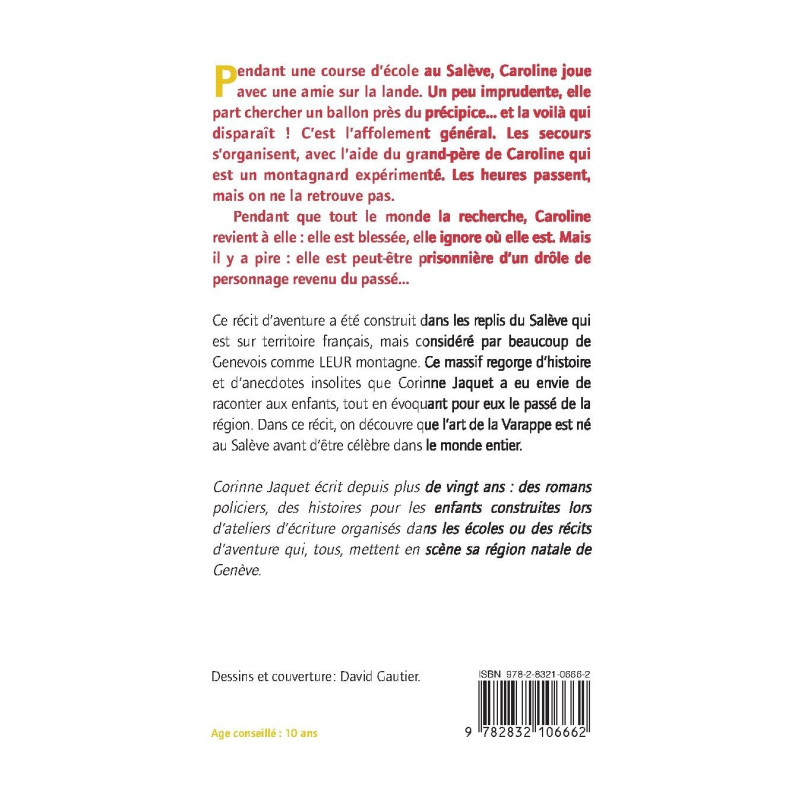 Ce récit d’aventure a été construit dans les replis du Salève qui est sur territoire français, mais considéré par beaucoup de Genevois comme LEUR montagne. Ce massif regorge d’histoire et d’anecdotes insolites que Corinne Jaquet a eu envie de raconter aux enfants, tout en évoquant pour eux le passé de la région. Dans ce récit, on découvre que l’art de la Varappe est né au Salève avant d’être célèbre dans le monde entier.