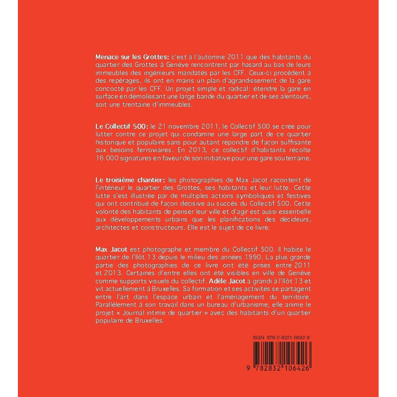 Le troisième chantier : les photographies de Max Jacot racontent de l’intérieur le quartier des Grottes, ses habitants et leur lutte. Cette lutte s’est illustrée par de multiples actions symboliques et festives qui ont contribué de façon décisive au succès du Collectif 500. Cette volonté des habitants de penser leur ville et d’agir est aussi essentielle aux développements urbains que les planifications des décideurs, architectes et constructeurs. Elle est le sujet de ce livre.