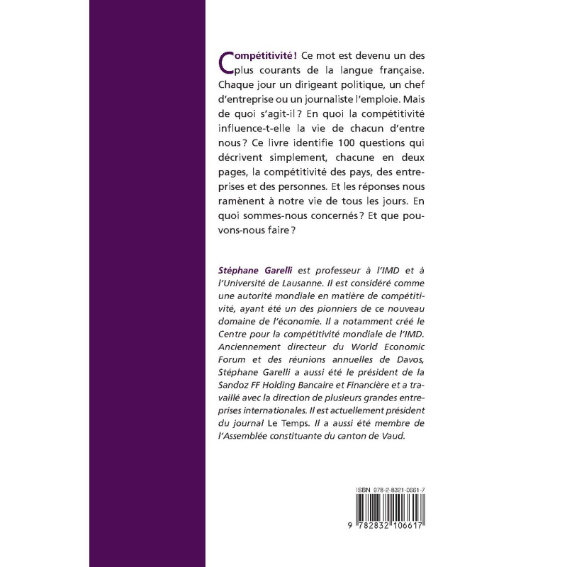 Compétitivité ! Ce mot est devenu un des plus courants de la langue française. Chaque jour un dirigeant politique, un chef d’entreprise ou un journaliste l’emploie. Mais de quoi s’agit-il ? En quoi la compétitivité influence-t-elle la vie de chacun d’entre nous? Ce livre identifie 100 questions qui décrivent simplement, chacune en deux pages, la compétitivité des pays, des entreprises et des personnes. Et les réponses nous ramènent à notre vie de tous les jours. En quoi sommes-nous concernés ? Et que pouvons-nous faire?