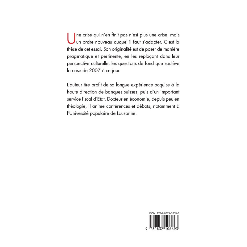 Une crise qui n’en finit pas n’est plus une crise, mais un ordre nouveau auquel il faut s’adapter. C’est la thèse de cet essai. Son originalité est de poser de manière pragmatique et pertinente, en les replaçant dans leur perspective culturelle, les questions de fond que soulève la crise de 2007 à ce jour.