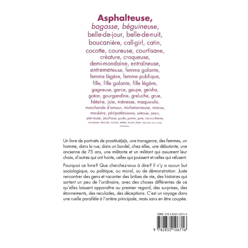 Un livre de portraits de prostitué(e)s, une transgenre, des femmes, un homme, dans la rue, dans un bordel, chez elles, une débutante, une ancienne de 75 ans, une militante et un militant qui assument leur choix, d’autres qui ont honte, celles qui jouissent et celles qui refusent. Pourquoi ce livre ? Que cherchez-vous à dire ? Il n’y a aucun but sociologique, ou politique, ou moral, ou de démonstration. Juste rencontrer des gens et raconter des bribes de vie, des histoires qui sortent un peu de l’ordinaire, avec des choses différentes de ce qu’elles laissent apparaître au premier regard, des surprises, des étonnements, des reculades, des déceptions. C’est un voyage dans une ruelle parallèle à l’artère principale, mais sans en être coupée.