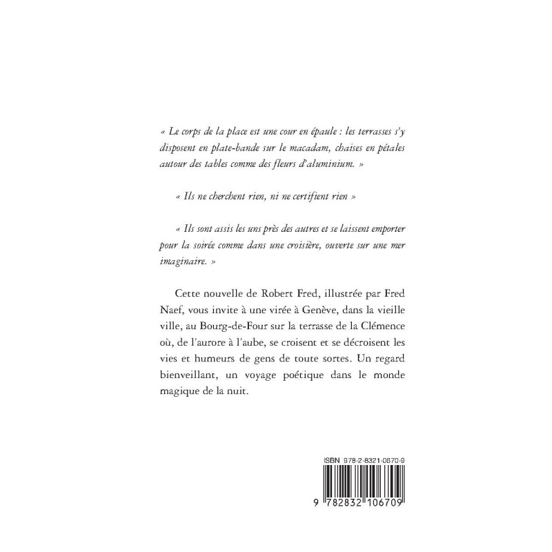 Cette nouvelle de Robert Fred, illustrée par Fred Naef, vous invite à une virée à Genève, dans la vieille ville, au Bourg-de-Four, sur la terrasse de la Clémence où de l’aurore à l’aube se croisent et se décroisent les vies et humeurs de gens de toute sortes. Un regard bienveillant, un voyage poétique dans le monde magique de la nuit.