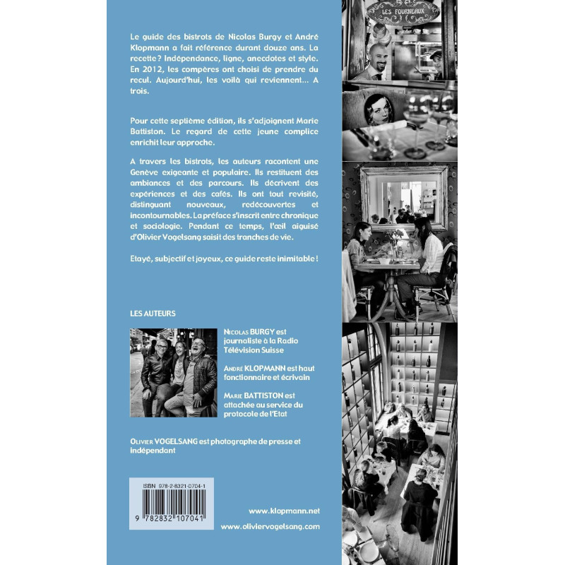 Pour cette septième édition, ils s’adjoignent Marie Battiston. Le regard de cette jeune complice enrichit leur approche. A travers les bistrots, les auteurs racontent une Genève exigeante et populaire. Ils restituent des ambiances et des parcours. Ils décrivent des expériences et des cafés. Ils ont tout revisité, distinguant nouveaux, redécouvertes et incontournables. La préface s’inscrit entre chronique et sociologie. Pendant ce temps, l’œil aiguisé d’Olivier Vogelsang saisit des tranches de vie.