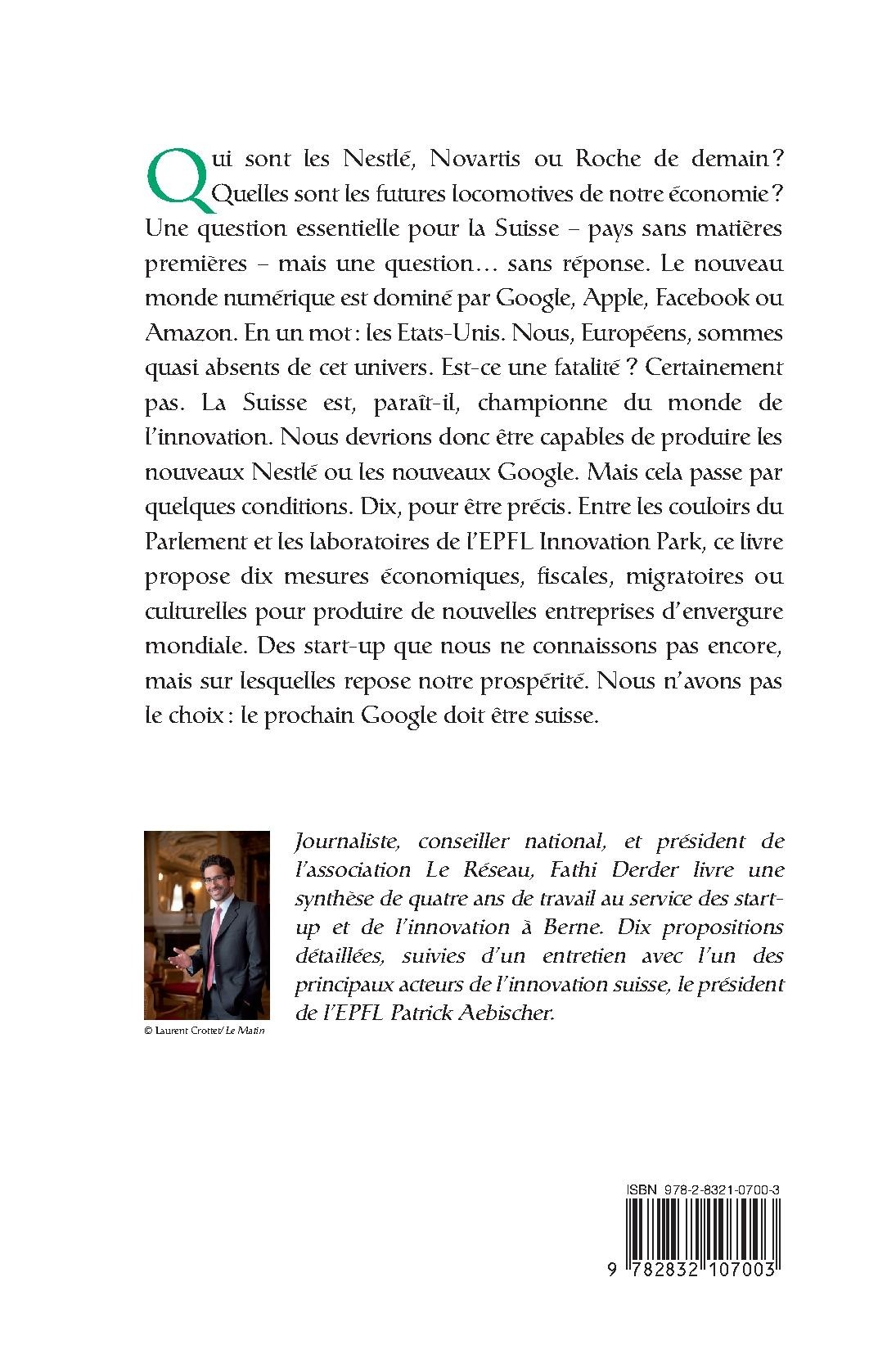 Qui sont les Nestlé, Novartis ou Roche de demain ? Quelles sont les futures locomotives de notre économie ? Une question essentielle pour la Suisse – pays sans matières premières –. mais une question… sans réponse. Le nouveau monde numérique est dominé par Google, Apple, Facebook ou Amazon. En un mot: les Etats-Unis. Nous, Européens, sommes quasi absents de cet univers. Est-ce une fatalité ? Certainement pas. La Suisse est, paraît-il, championne du monde de l’innovation. Nous devrions donc être capables de produire les nouveaux Nestlé ou les nouveaux Google. Mais cela passe par quelques conditions. Dix, pour être précis. Entre les couloirs du Parlement et les laboratoires de l’EPFL Innovation Park, ce livre propose dix mesures économiques, fiscales, migratoires ou culturelles pour produire de nouvelles entreprises d’envergure mondiale. Des start-up que nous ne connaissons pas encore, mais sur lesquelles repose notre prospérité. Nous n’avons pas le choix : le prochain Google doit être suisse.