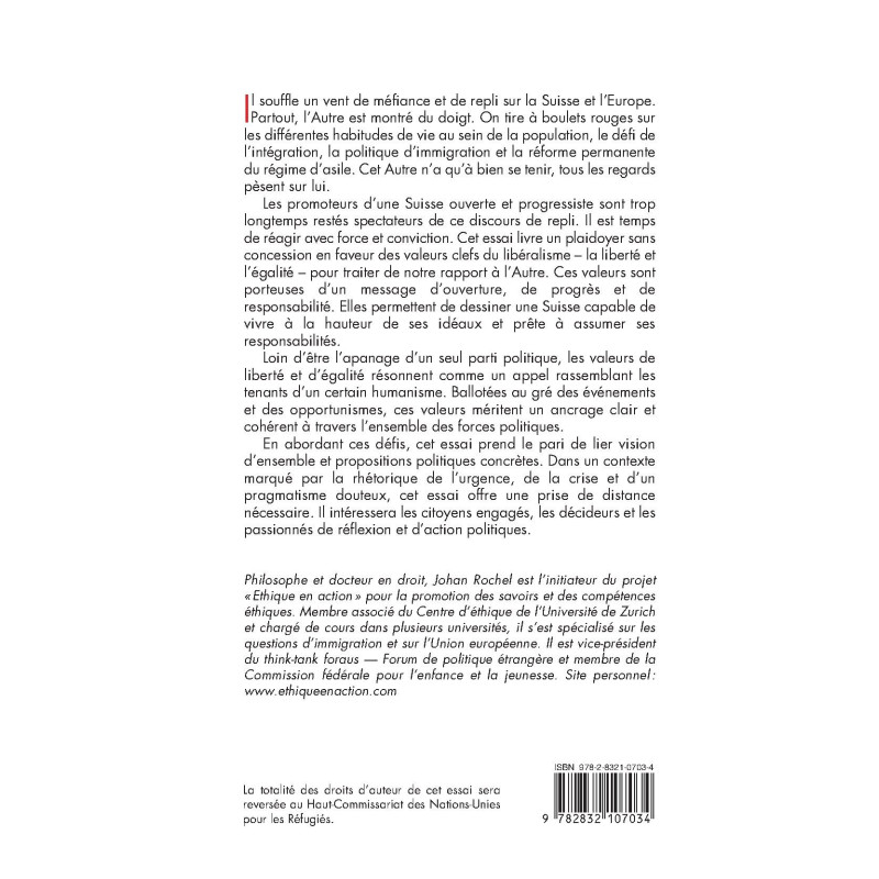 Il souffle un vent de méfiance et de repli sur la Suisse et l’Europe. Partout, l’Autre est montré du doigt. On tire à boulets rouges sur les différentes habitudes de vie au sein de la population, le défi de l’intégration, la politique d’immigration et la réforme permanente du régime d’asile. Cet Autre n’a qu’à bien se tenir, tous les regards pèsent sur lui. Les promoteurs d’une Suisse ouverte et progressiste sont trop longtemps restés spectateurs de ce discours de repli. Il est temps de réagir avec force et conviction. Cet essai livre un plaidoyer sans concession en faveur des valeurs clefs du libéralisme – la liberté et l’égalité – pour traiter de notre rapport à l’Autre. Ces valeurs sont porteuses d’un message d’ouverture, de progrès et de responsabilité. Elles permettent de dessiner une Suisse capable de vivre à la hauteur de ses idéaux et prête à assumer ses responsabilités. Loin d’être l’apanage d’un seul parti politique, les valeurs de liberté et d’égalité résonnent comme un appel rassemblant les tenants d’un certain humanisme. Ballotées au gré des événements et des opportunismes, ces valeurs méritent un ancrage clair et cohérent à travers l’ensemble des forces politiques. En abordant ces défis, cet essai prend le pari de lier vision d’ensemble et propositions politiques concrètes. Dans un contexte marqué par la rhétorique de l’urgence, de la crise et d’un pragmatisme douteux, cet essai offre une prise de distance nécessaire. Il intéressera les citoyens engagés, les décideurs et les passionnés de réflexion et d’action politiques. Philosophe et docteur en droit, Johan Rochel est l’initiateur du projet «Ethique en action » pour la promotion des savoirs et des compétences éthiques. Membre associé du Centre d’éthique de l’Université de Zurich et chargé de cours dans plusieurs universités, il s’est spécialisé sur les questions d’immigration et sur l’Union européenne. Il est vice-président du think-tank foraus — Forum de politique étrangère et membre de la Commission fédérale pour l’enfance et la jeunesse.