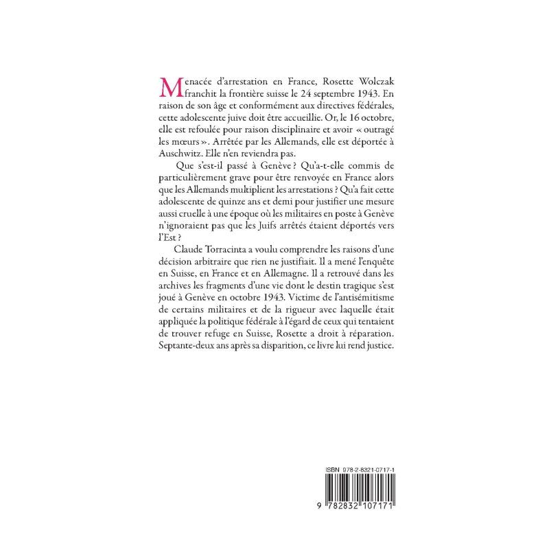 Menacée d’arrestation en France, Rosette Wolczak franchit la frontière suisse le 24 septembre 1943. En raison de son âge et conformément aux directives fédérales, cette adolescente juive doit être accueillie. Or, le 16 octobre, elle est refoulée pour raison disciplinaire et avoir « outragé les mœurs ». Arrêtée par les Allemands, elle est déportée à Auschwitz. Elle n’en reviendra pas. Que s’est-il passé à Genève ? Qu’a-t-elle commis de particulièrement grave pour être renvoyée en France alors que les Allemands multiplient les arrestations ? Qu’a fait cette adolescente de quinze ans et demi pour justifier une mesure aussi cruelle à une époque où les militaires en poste à Genève n’ignoraient pas que les Juifs arrêtés étaient déportés vers l’Est? Claude Torracinta a voulu comprendre les raisons d’une décision arbitraire que rien ne justifiait. Il a mené l’enquête en Suisse, en France et en Allemagne. Il a retrouvé dans les archives les fragments d’une vie dont le destin tragique s’est joué à Genève en octobre 1943. Victime de l’antisémitisme de certains militaires et de la rigueur avec laquelle était appliquée la politique fédérale à l’égard de ceux qui tentaient de trouver refuge en Suisse, Rosette a droit à réparation. Septante-deux ans après sa disparition, ce livre lui rend justice.