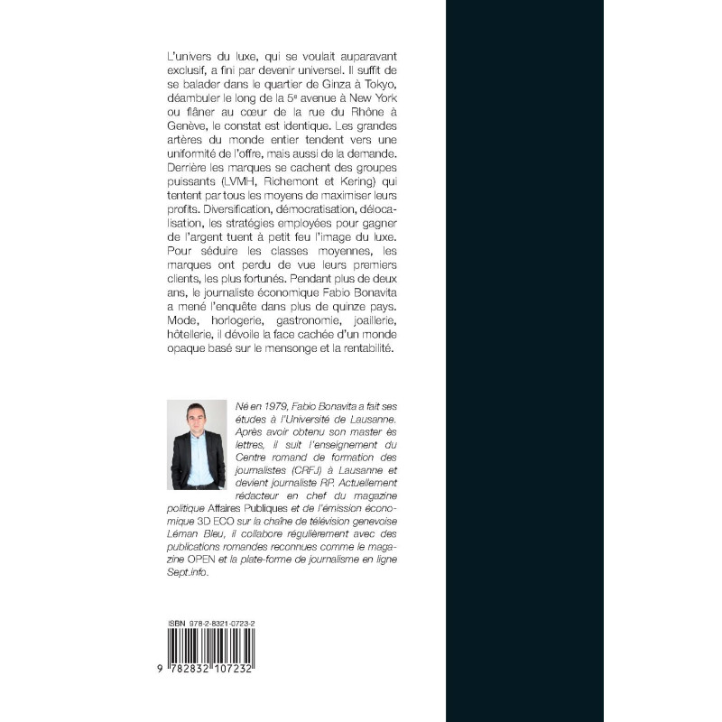 L’univers du luxe, qui se voulait auparavant exclusif, a fini par devenir universel. Il suffit de se balader dans le quartier de Ginza à Tokyo, déambuler le long de la 5e avenue à New York ou flâner au cœur de la rue du Rhône à Genève, le constat est identique. Les grandes artères du monde entier tendent vers une uniformité de l’offre, mais aussi de la demande. Derrière les marques se cachent des groupes puissants (LVMH, Richemont et Kering) qui tentent par tous les moyens de maximiser leurs profits. Diversification, démocratisation, délocalisation, les stratégies employées pour gagner de l’argent tuent à petit feu l’image du luxe. Pour séduire les classes moyennes, les marques ont perdu de vue leurs premiers clients, les plus fortunés. Pendant plus de deux ans, le journaliste économique Fabio Bonavita a mené l’enquête dans plus de quinze pays. Mode, horlogerie, gastronomie, joaillerie, hôtellerie, il dévoile la face cachée d’un monde opaque basé sur le mensonge et la rentabilité.