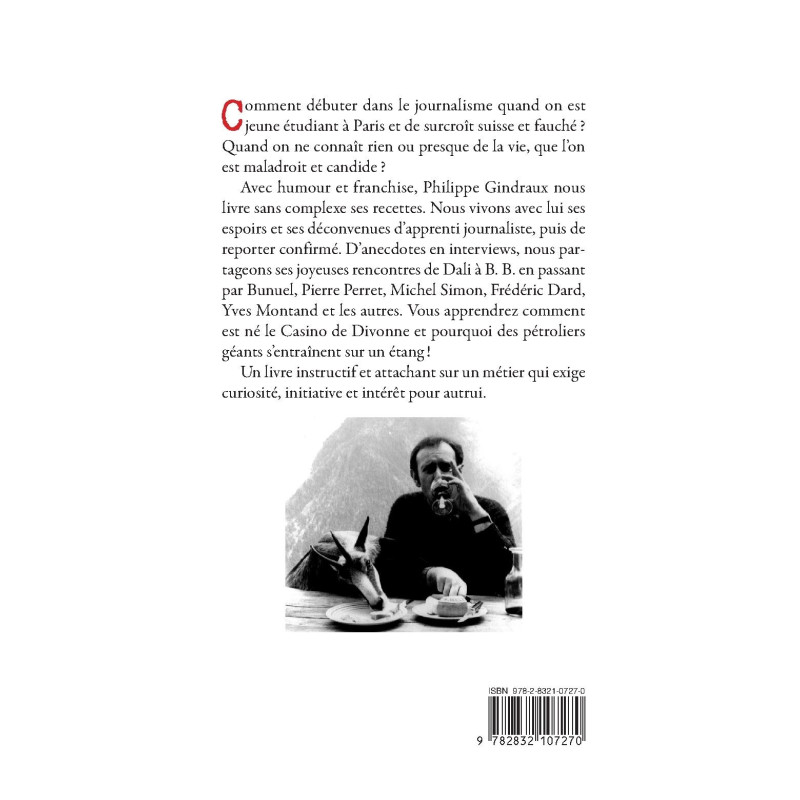 Avec humour et franchise, Philippe Gindraux nous livre sans complexe ses recettes. Nous vivons avec lui ses espoirs et ses déconvenues d’apprenti journaliste, puis de reporter confirmé. D’anecdotes en interviews, nous partageons ses joyeuses rencontres de Dali à B. B. en passant par Bunuel, Pierre Perret, Michel Simon, Frédéric Dard, Yves Montand et les autres. Vous apprendrez comment est né le Casino de Divonne et pourquoi des pétroliers géants s’entraînent sur un étang !
