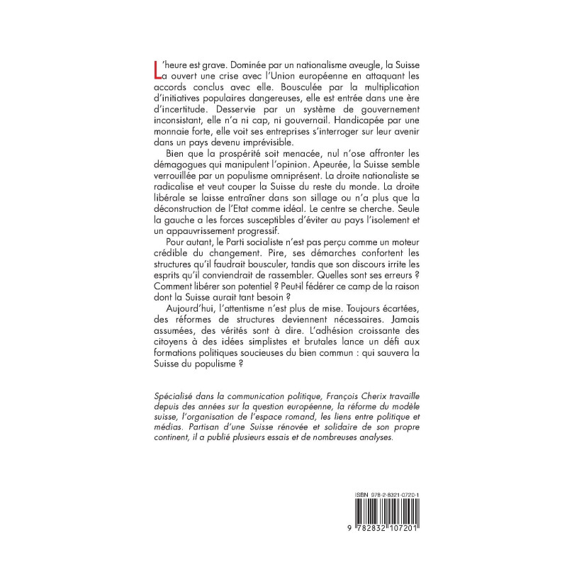 L’heure est grave. Dominée par un nationalisme aveugle, la Suisse a ouvert une crise avec l’Union européenne en attaquant les accords conclus avec elle. Bousculée par la multiplication d’initiatives populaires dangereuses, elle est entrée dans une ère d’incertitude. Desservie par un système de gouvernement inconsistant, elle n’a ni cap, ni gouvernail. Handicapée par une monnaie forte, elle voit ses entreprises s’interroger sur leur avenir dans un pays devenu imprévisible. Bien que la prospérité soit menacée, nul n’ose affronter les démagogues qui manipulent l’opinion. Apeurée, la Suisse semble verrouillée par un populisme omniprésent. La droite nationaliste se radicalise et veut couper la Suisse du reste du monde. La droite libérale se laisse entraîner dans son sillage ou n’a plus que la déconstruction de l’Etat comme idéal. Le centre se cherche. Seule la gauche a les forces susceptibles d’éviter au pays l’isolement et un appauvrissement progressif. Pour autant, le Parti socialiste n’est pas perçu comme un moteur crédible du changement. Pire, ses démarches confortent les structures qu’il faudrait bousculer, tandis que son discours irrite les esprits qu’il conviendrait de rassembler. Quelles sont ses erreurs ? Comment libérer son potentiel ? Peut-il fédérer ce camp de la raison dont la Suisse aurait tant besoin ? Aujourd’hui, l’attentisme n’est plus de mise. Toujours écartées, des réformes de structures deviennent nécessaires. Jamais assumées, des vérités sont à dire. L’adhésion croissante des citoyens à des idées simplistes et brutales lance un défi aux formations politiques soucieuses du bien commun : qui sauvera la Suisse du populisme ?