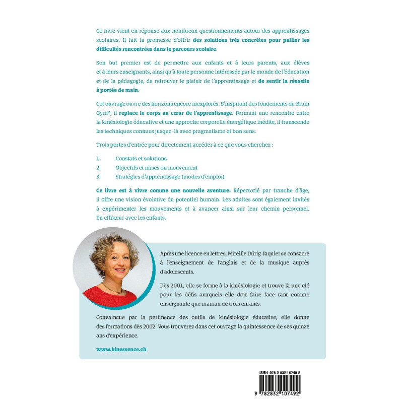 Après une licence en lettres, Mireille Dürig-Jaquier se consacre à l’enseignement de l’anglais et de la musique auprès d’adolescents. Dès 2001, elle se forme à la kinésiologie et trouve là une clé pour les défis auxquels elle doit faire face tant comme enseignante que maman de trois enfants. Convaincue par la pertinence des outils de kinésiologie éducative, elle donne des formations dès 2002. Vous trouverez dans cet ouvrage la quintessence de ses quinze ans d’expérience.