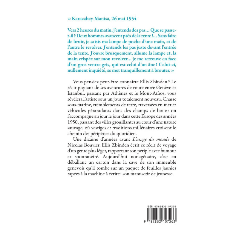 Vous pensiez peut-être connaître Ellis Zbinden ? Le récit piquant de ses aventures de route entre Genève et Istanbul, passant par Athènes et le Mont-Athos, vous révélera l’artiste sous un jour totalement nouveau. Chasse sous-marine, tremblements de terre, traversées en mer et véhicules pétaradants dans des champs de boue : on l’accompagne au jour le jour dans cette Europe des années 1950, passant des villes grouillantes au cœur d’une nature sauvage, où vestiges et traditions millénaires croisent le chemin des péripéties du quotidien. Une dizaine d’années avant L’usage du monde de Nicolas Bouvier, Ellis Zbinden écrit ce récit de voyage d’un genre plus léger, rapportant son périple avec humour et spontanéité. Aujourd’hui nonagénaire, c’est en déballant un carton dans la cave de son immeuble genevois qu’il tombe sur un paquet de feuilles jaunies tapées à la machine à écrire : son manuscrit de jeunesse.