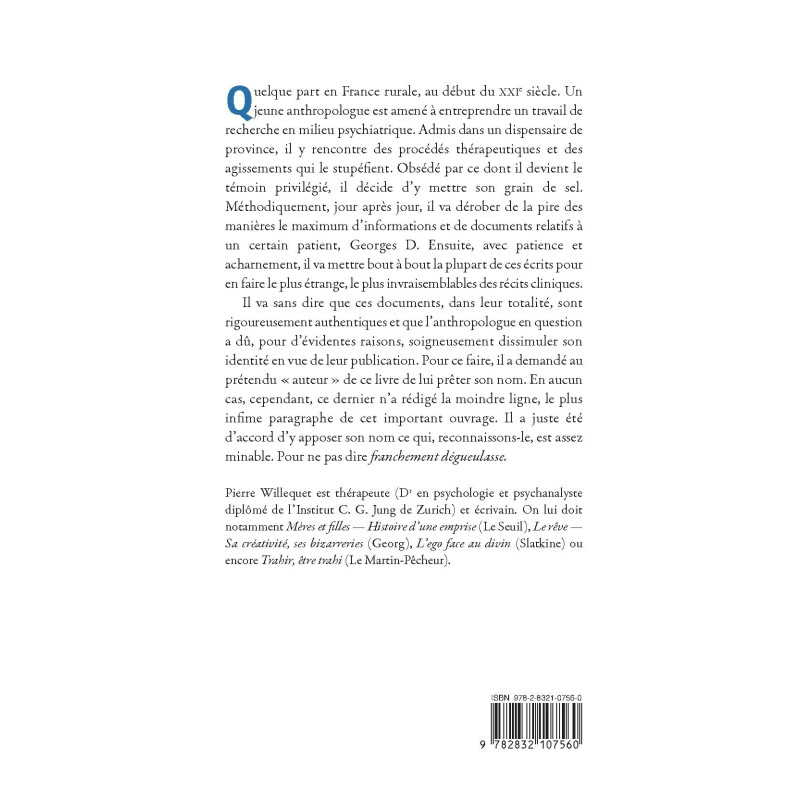 Quelque part en France rurale, au début du XXIe siècle. Un jeune anthropologue est amené à entreprendre un travail de recherche en milieu psychiatrique. Admis dans un dispensaire de province, il y rencontre des procédés thérapeutiques et des agissements qui le stupéfient. Obsédé par ce dont il devient le témoin privilégié, il décide d’y mettre son grain de sel. Méthodiquement, jour après jour, il va dérober de la pire des manières le maximum d’informations et de documents relatifs à un certain patient, Georges D. Ensuite, avec patience et acharnement, il va mettre bout à bout la plupart de ces écrits pour en faire le plus étrange, le plus invraisemblables des récits cliniques.