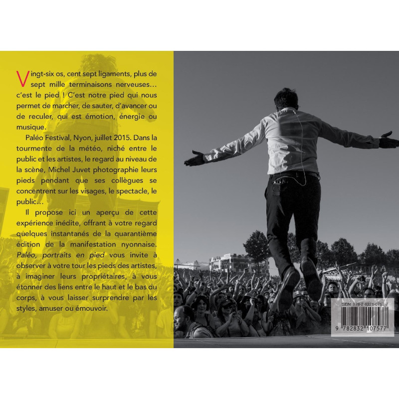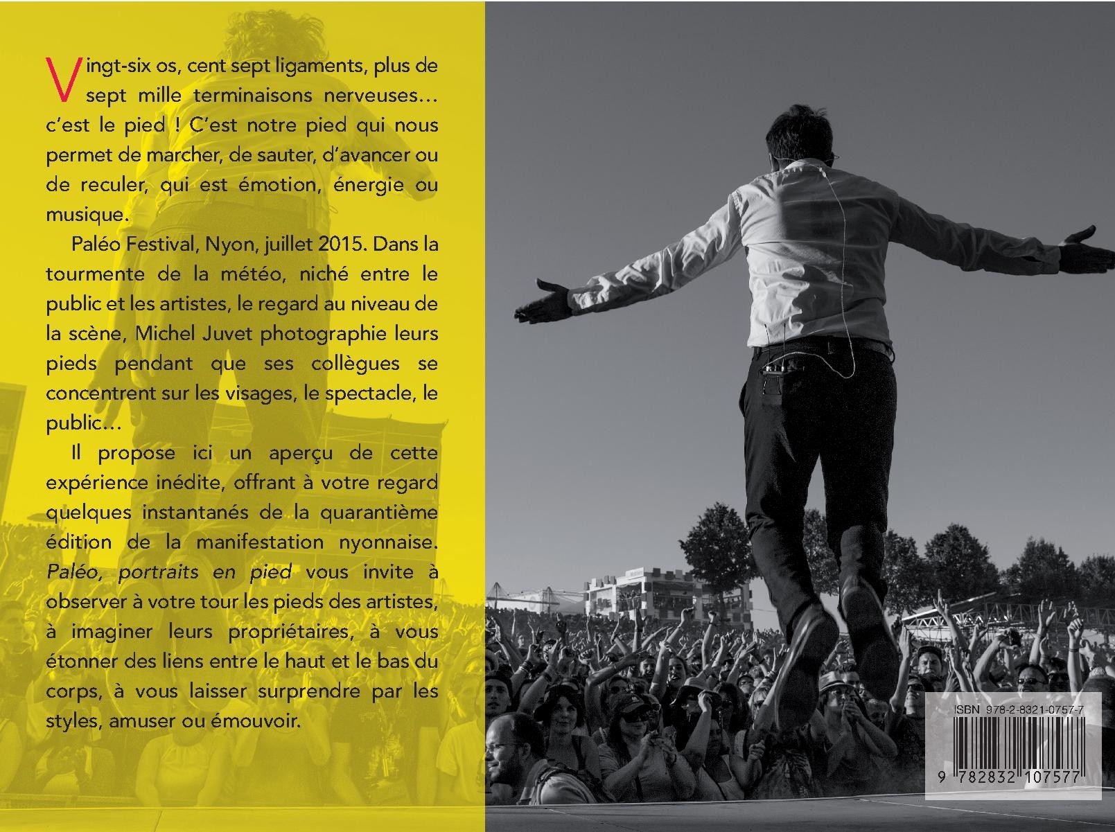 Il propose ici un aperçu de cette expérience inédite, offrant à votre regard quelques instantanés de la quarantième édition de la manifestation nyonnaise. Paléo, portraits en pied vous invite à observer à votre tour les pieds des artistes, à imaginer leurs propriétaires, à vous étonner des liens entre le haut et le bas du corps, à vous laisser surprendre par les styles, amuser ou émouvoir.