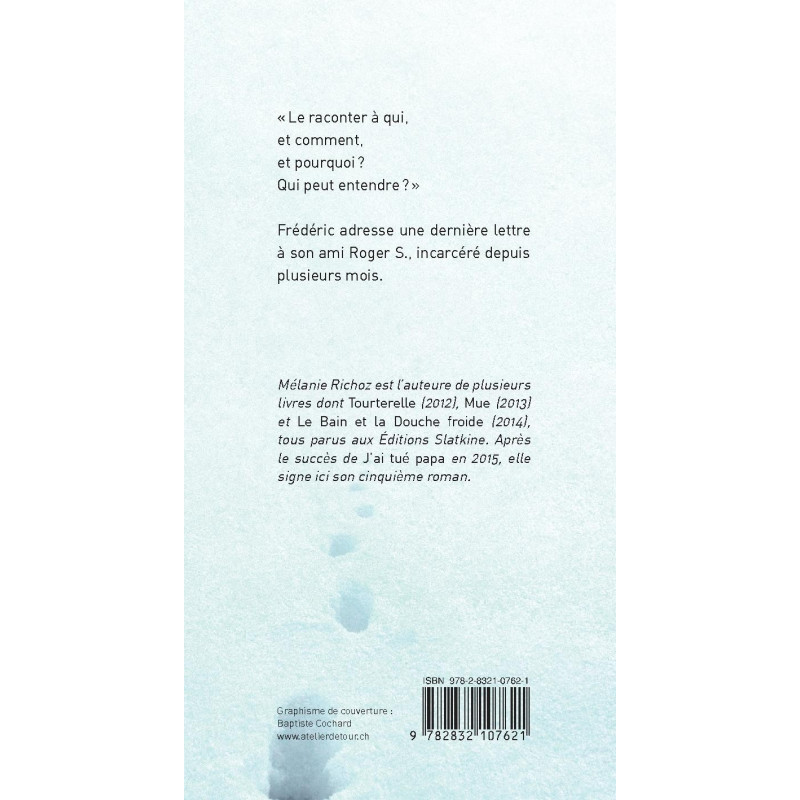 Mélanie Richoz est l’auteure de plusieurs livres dont Tourterelle (2012), Mue (2013) et Le Bain et la Douche froide (2014), tous parus aux Éditions Slatkine. Après le succès de J’ai tué papa en 2015, elle signe ici son cinquième roman.