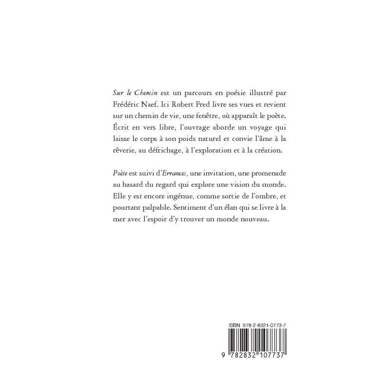 Sur le Chemin est un parcours en poésie illustré par Frédéric Naef. Ici Robert Fred livre ses vues et revient sur un chemin de vie, une fenêtre, où apparaît le poète. Écrit en vers libre, l’ouvrage aborde un voyage qui laisse le corps à son poids naturel et convie l’âme à la rêverie, au défrichage, à l’exploration et à la création.