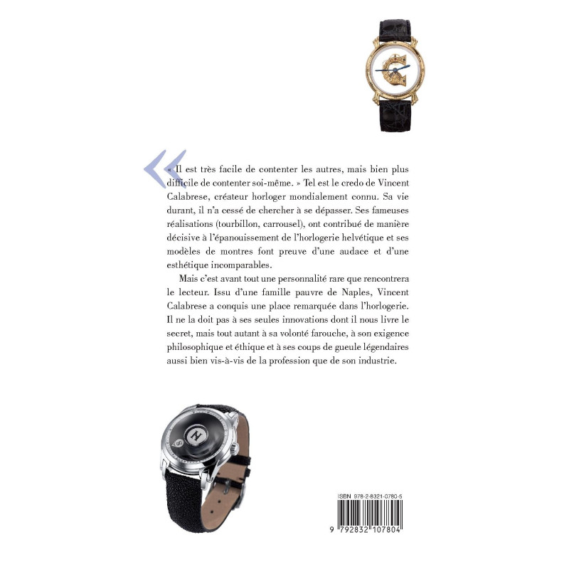 Mais c’est avant tout une personnalité rare que rencontrera le lecteur. Issu d’une famille pauvre de Naples, Vincent Calabrese a conquis une place remarquée dans l’horlogerie. Il ne la doit pas à ses seules innovations dont il nous livre le secret, mais tout autant à sa volonté farouche, à son exigence philosophique et éthique et à ses coups de gueule légendaires aussi bien vis-à-vis de la profession que de son industrie.