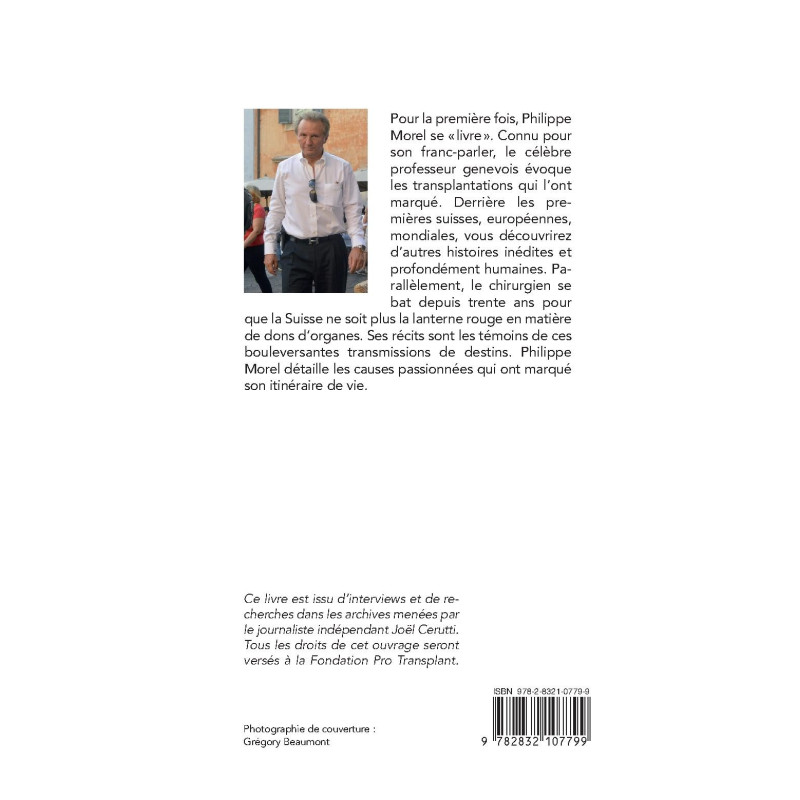Pour la première fois, Philippe Morel se « livre ». Connu pour son franc-parler, le célèbre professeur genevois évoque les transplantations qui l’ont marqué. Derrière les premières suisses, européennes, mondiales, vous découvrirez d’autres histoires inédites et profondément humaines. Parallèlement, le chirurgien se bat depuis trente ans pour que la Suisse ne soit plus la lanterne rouge en matière de dons d’organes. Ses récits sont les témoins de ces bouleversantes transmissions de destins. Philippe Morel détaille les causes passionnées qui ont marqué son itinéraire de vie.
