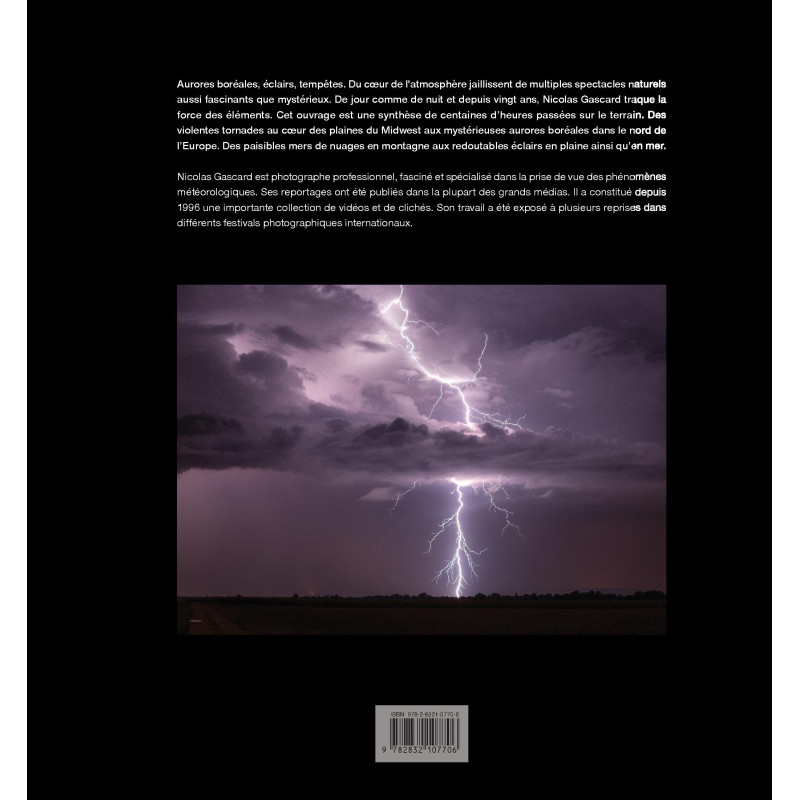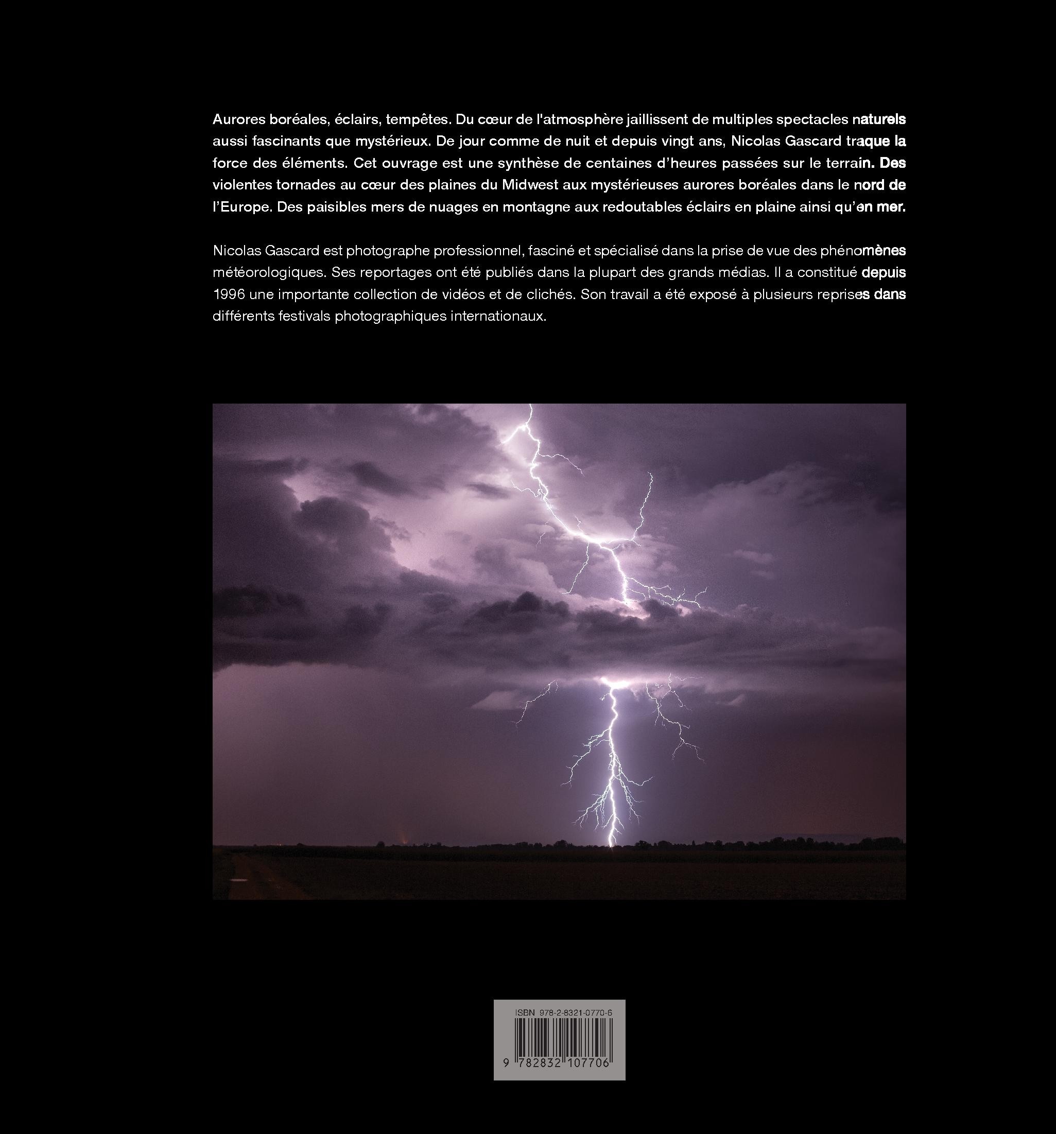 Aurores boréales, éclairs, tempêtes. Du coeur de l'atmosphère jaillissent de multiples spectacles naturels aussi fascinants que mystérieux. De jour comme de nuit et depuis vingt ans, Nicolas Gascard traque la force des éléments. Cet ouvrage est une synthèse de centaines d’heures passées sur le terrain. Des violentes tornades au coeur des plaines du Midwest aux mystérieuses aurores boréales dans le nord de l’Europe. Des paisibles mers de nuages en montagne aux redoutables éclairs en plaine ainsi qu’en mer.