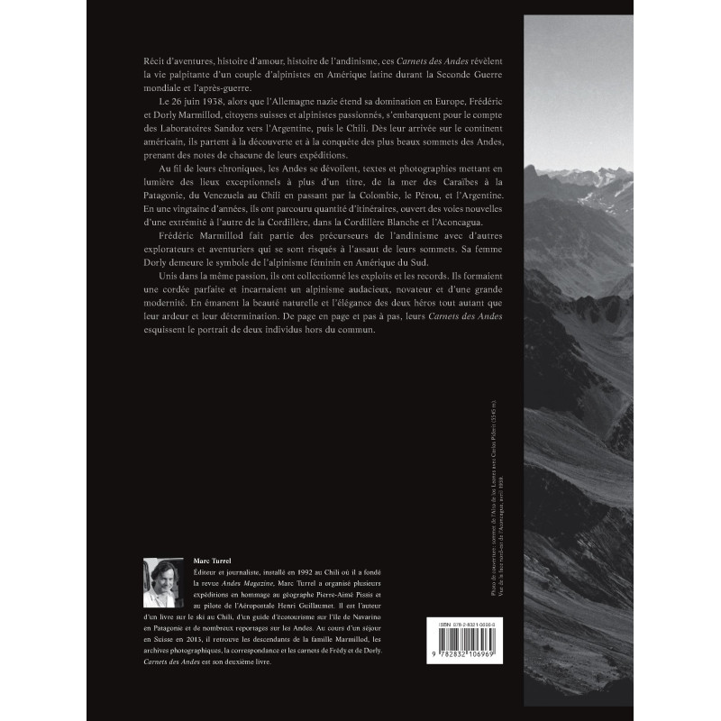 Marc Turrel Éditeur et journaliste, installé en 1992 au Chili où il a fondé la revue Andes Magazine, Marc Turrel a organisé plusieurs expéditions en hommage au géographe Pierre-Aimé Pissis et au pilote de l’Aéropostale Henri Guillaumet. Il est l’auteur d’un livre sur le ski au Chili, d’un guide d’écotourisme sur l’île de Navarino en Patagonie et de nombreux reportages sur les Andes. Au cours d’un séjour en Suisse en 2013, il retrouve les descendants de la famille Marmillod, les archives photographiques, la correspondance et les carnets de Frédy et de Dorly. Carnets des Andes est son deuxième livre.