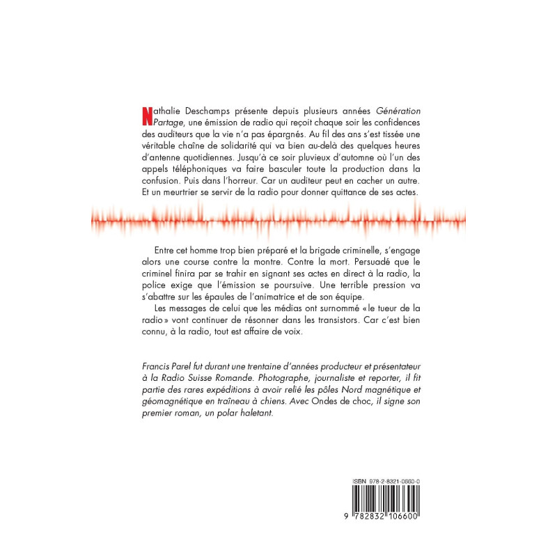 Francis Parel fut durant une trentaine d’années producteur et présentateur à la Radio Suisse Romande. Photographe, journaliste et reporter, il fit partie des rares expéditions à avoir relié les pôles Nord magnétique et géomagnétique en traîneau à chiens. Avec Ondes de choc, il signe son premier roman, un polar haletant.