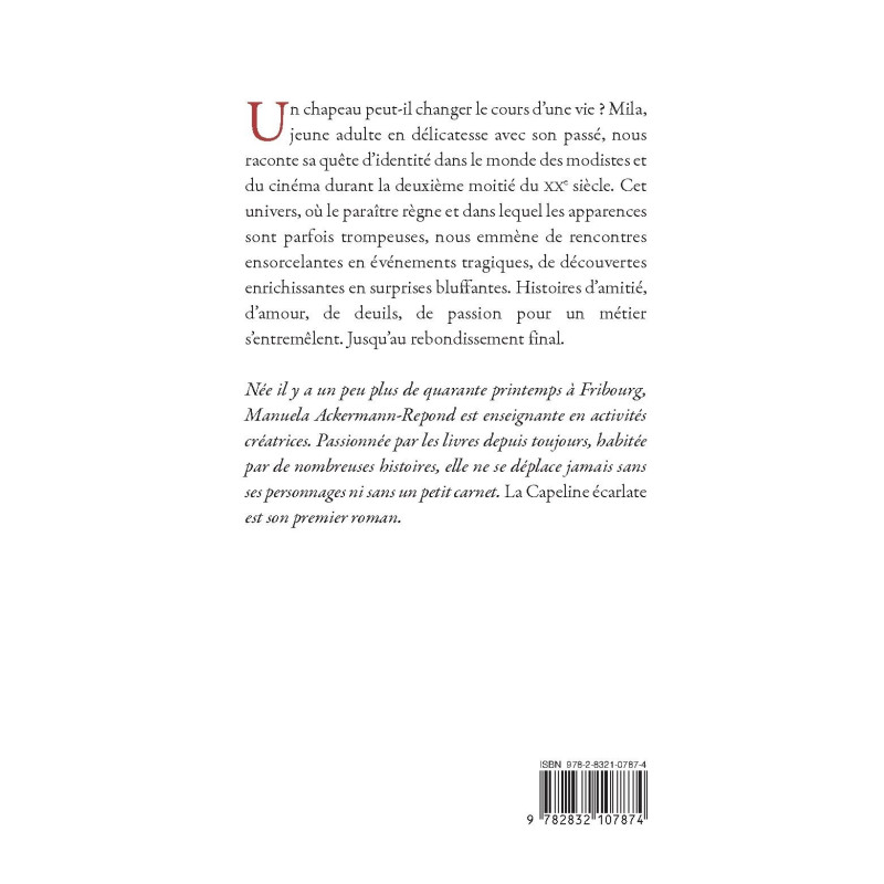 Née il y a un peu plus de quarante printemps à Fribourg, Manuela Ackermann-Repond est enseignante en activités créatrices. Passionnée par les livres depuis toujours, habitée par de nombreuses histoires, elle ne se déplace jamais sans ses personnages ni sans un petit carnet. La Capeline écarlate est son premier roman.