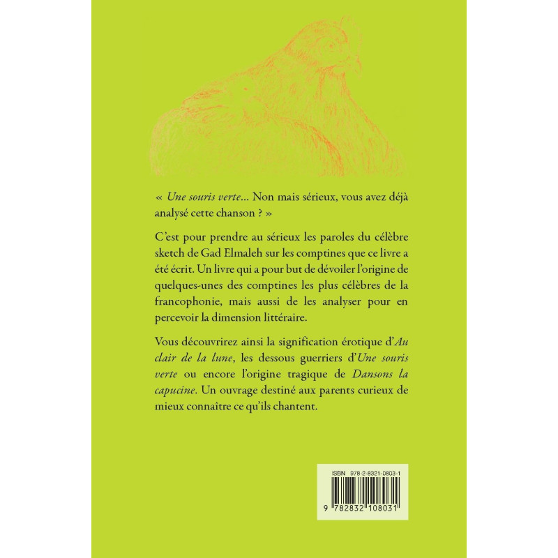 C’est pour prendre au sérieux les paroles du célèbre sketch de Gad Elmaleh sur les comptines que ce livre a été écrit. Un livre qui a pour but de dévoiler l’origine de quelques-unes des comptines les plus célèbres de la francophonie, mais aussi de les analyser pour en percevoir la dimension littéraire.