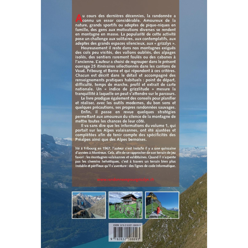 Heureusement il reste dans nos montagnes exiguës des cols peu visités, des vallons oubliés, des alpages isolés, des sentiers rarement foulés ou des cabanes à l’ancienne. L’auteur a choisi de regrouper dans le présent ouvrage 25 itinéraires sélectionnés dans les cantons de Vaud, Fribourg et Berne et qui répondent à ces critères. Chacun est décrit dans le détail et accompagné des renseignements pratiques habituels : point de départ, difficulté, temps de marche, profil et extrait de carte nationale. Un « indice de grizzlitude » mesure la tranquillité à laquelle on peut s’attendre sur le parcours. Le livre prodigue également des conseils pour planifier et réaliser, avec les outils modernes, du bon sens et quelques précautions, ses propres randonnées sauvages.