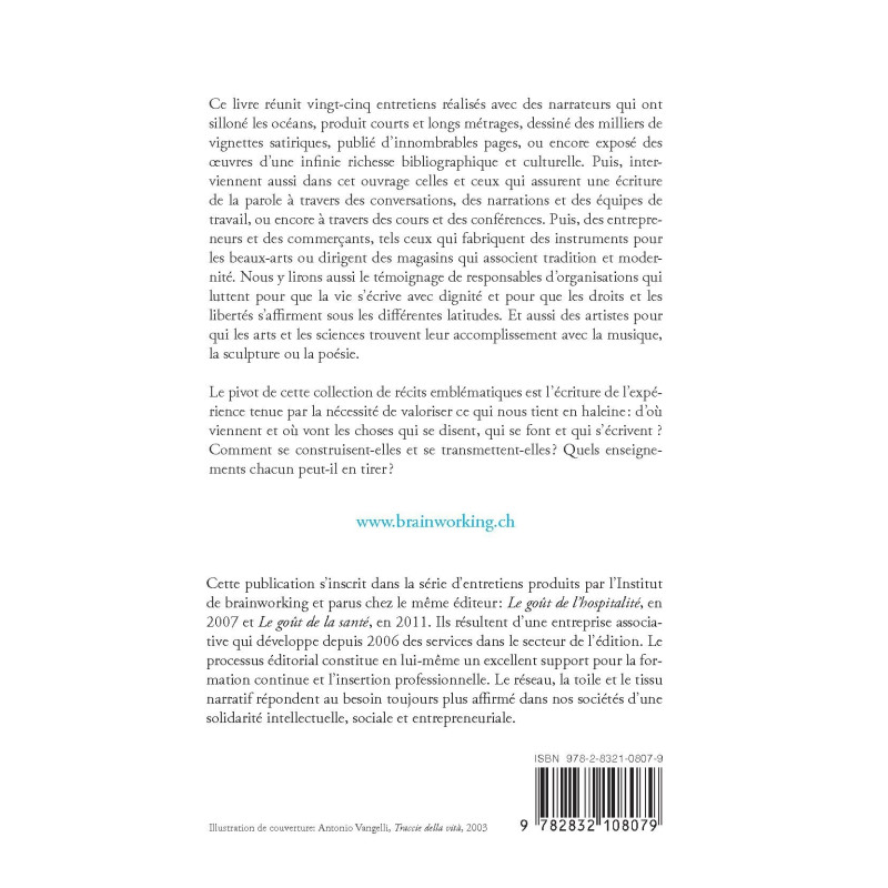 Cette publication s’inscrit dans la série d’entretiens produits par l’Institut de brainworking et parus chez le même éditeur : Le goût de l’hospitalité, en 2007 et Le goût de la santé, en 2011. Ils résultent d’une entreprise associative qui développe depuis 2006 des services dans le secteur de l’édition. Le processus éditorial constitue en lui-même un excellent support pour la formation continue et l’insertion professionnelle. Le réseau, la toile et le tissu narratif répondent au besoin toujours plus affirmé dans nos sociétés d’une solidarité intellectuelle, sociale et entrepreneuriale.