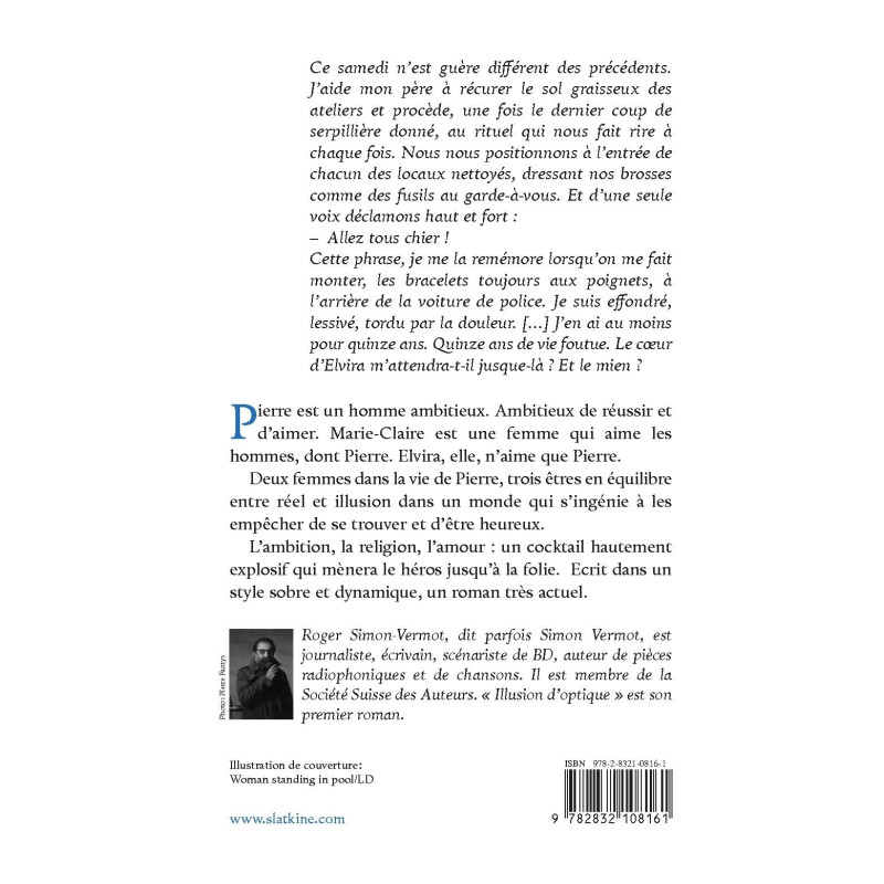 Roger Simon-Vermot, dit parfois Simon Vermot, est journaliste, écrivain, scénariste de BD, auteur de pièces radiophoniques et de chansons. Il est membre de la Société Suisse des Auteurs. «Illusion d’optique » est son premier roman.