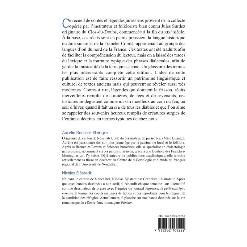 Ce recueil de contes et légendes jurassiens provient de la collecte opérée par l’instituteur et folkloriste bien connu Jules Surdez des Clos-du-Doubs, commencée à la fin du XIXe siècle. À la base, ces récits sont en patois jurassien, la langue historique du Jura suisse et de la Franche-Comté, appartenant au groupe des langues d’oïl du nord de la France. Ces textes ont été traduits afin de faciliter la compréhension du lecteur, mais on a laissé des traces du lexique et la tournure typique des phrases dialectales, afin de garder la musicalité de la terre jurassienne. Un glossaire des termes les plus intéressants complète cette édition. L’idée de cette publication est de faire ressortir un patrimoine linguistique et culturel de textes anciens mais qui peuvent se révéler aussi très modernes. Contes à rire, légendes qui donnent le frisson, récits merveilleux remplis de sorcières, de fées et de revenants, ces histoires se dégustent comme un vin moelleux au coin du feu, un soir d’hiver, quand il fait un cru de tous les diables et que l’on aime se rappeler des souvenirs heureux remplis de créatures surgies de l’enfance décrites en termes typiques de chez nous.