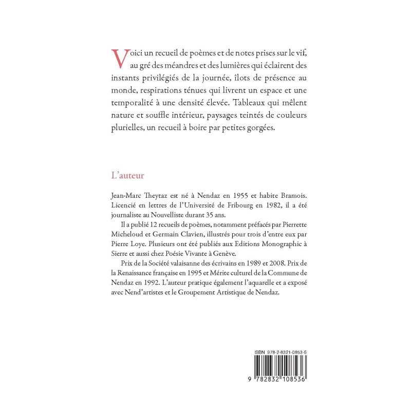 Voici un recueil de poèmes et de notes prises sur le vif, au gré des méandres et des lumières qui éclairent des instants privilégiés de la journée, îlots de présence au monde, respirations ténues qui livrent un espace et une temporalité à une densité élevée. Tableaux qui mêlent nature et souffle intérieur, paysages teintés de couleurs plurielles, un recueuil à boire par petites gorgées.