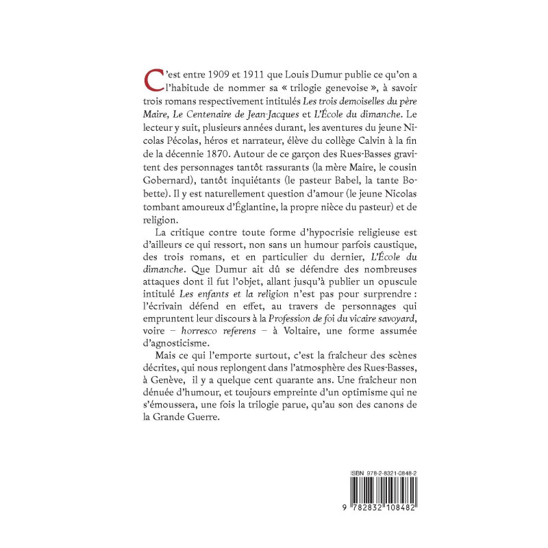C’est entre 1909 et 1911 que Louis Dumur publie ce qu’on a l’habitude de nommer sa « trilogie genevoise », à savoir trois romans respectivement intitulés Les trois demoiselles du père Maire, Le Centenaire de Jean-Jacques et L’École du dimanche. Le lecteur y suit, plusieurs années durant, les aventures du jeune Nicolas Pécolas, héros et narrateur, élève du collège Calvin à la fin de la décennie 1870. Autour de ce garçon des Rues-Basses gravitent des personnages tantôt rassurants (la mère Maire, le cousin Gobernard), tantôt inquiétants (le pasteur Babel, la tante Bobette). Il y est naturellement question d’amour (le jeune Nicolas tombant amoureux d’Églantine, la propre nièce du pasteur) et de religion.