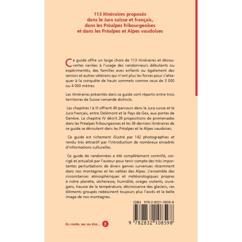 113 itinéraires proposés dans le Jura suisse et français, dans les Préalpes fribourgeoises et dans les Préalpes et Alpes vaudoises
