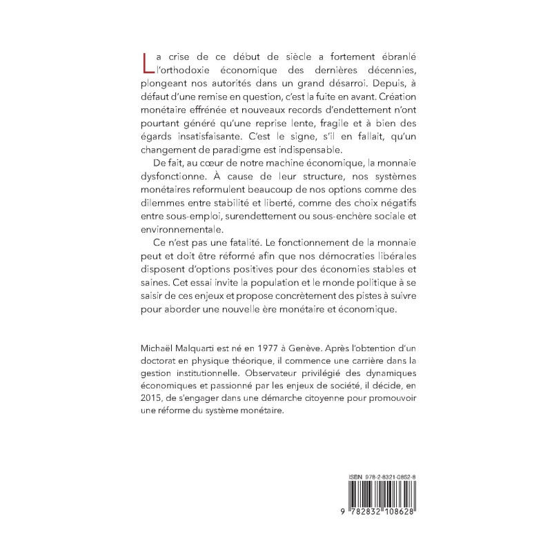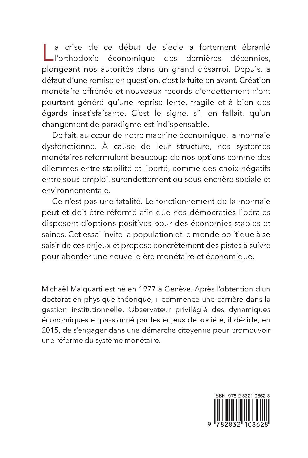 Ce n’est pas une fatalité. Le fonctionnement de la monnaie peut et doit être réformé afin que nos démocraties libérales disposent d’options positives pour des économies stables et saines. Cet essai invite la population et le monde politique à se saisir de ces enjeux et propose concrètement des pistes à suivre pour aborder une nouvelle ère monétaire et économique.