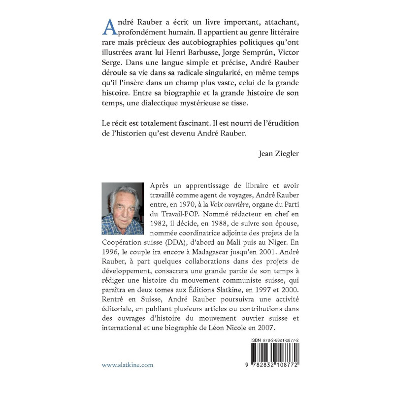 André Rauber a écrit un livre important, attachant, profondément humain. Il appartient au genre littéraire rare mais précieux des autobiographies politiques qu’ont illustrées avant lui Henri Barbusse, Jorge Semprún, Victor Serge. Dans une langue simple et précise, André Rauber déroule sa vie dans sa radicale singularité, en même temps qu’il l’insère dans un champ plus vaste, celui de la grande histoire. Entre sa biographie et la grande histoire de son temps, une dialectique mystérieuse se tisse.Le récit st totalement fascinant. Il est nourri de l’érudition de l’historien qu’est devenu André Rauber.