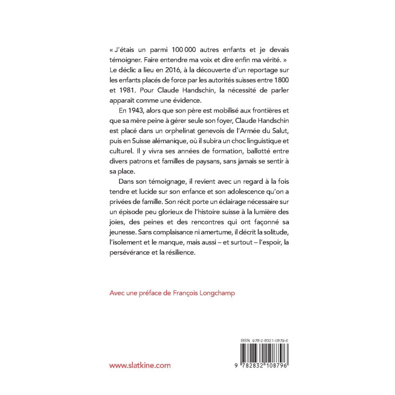 En 1943, alors que son père est mobilisé aux frontières et que sa mère peine à gérer seule son foyer, Claude Handschin est placé dans un orphelinat genevois de l’Armée du Salut, puis en Suisse alémanique, où il subira un choc linguistique et culturel. Il y vivra ses années de formation, ballotté entre divers patrons et familles de paysans, sans jamais se sentir à sa place.