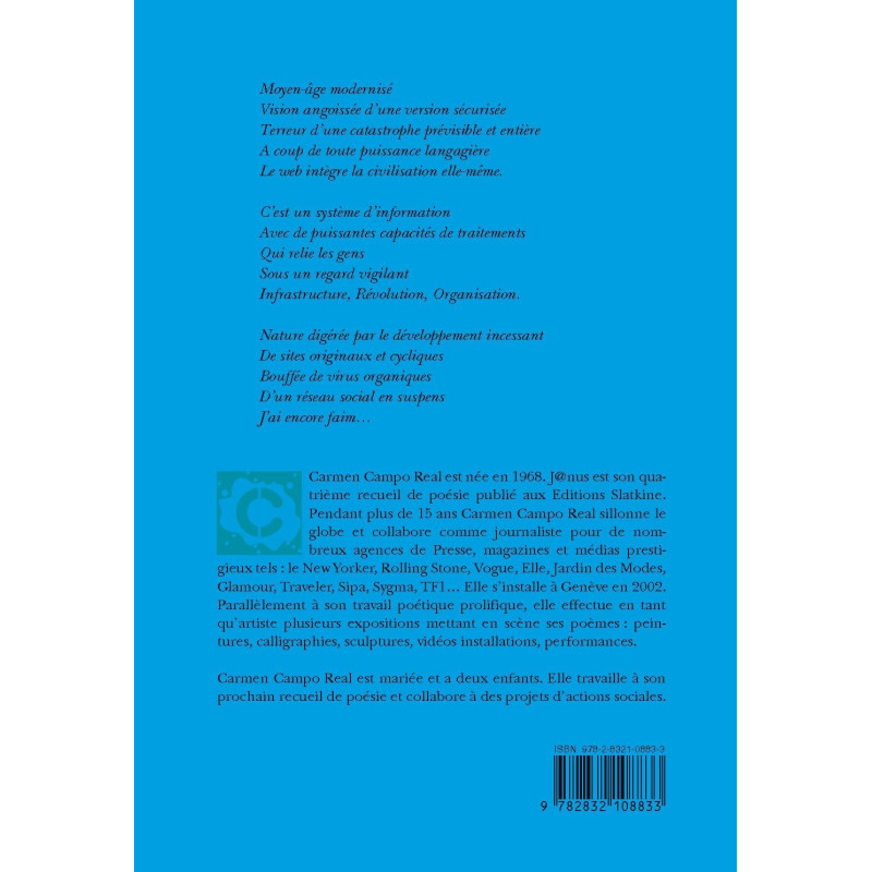 recueil de poésie publié aux Editions Slatkine. Pendant plus de 15 ans Carmen Campo Real sillonne le globe et collabore comme journaliste pour de nombreux agences de Presse, magazines et médias prestigieux tels : le New Yorker, Rolling Stone, Vogue, Elle, Jardin des Modes, Glamour, Traveler, Sipa, Sygma, TF1… Elle s’installe à Genève en 2002. Parallèlement à son travail poétique prolifique, elle effectue en tant qu’artiste plusieurs expositions mettant en scène ses poèmes : peintures, calligraphies, sculptures, vidéos installations, performances. Carmen Campo Real est mariée et a deux enfants. Elle travaille à son prochain recueil de poésie et collabore à des projets d’actions sociales.