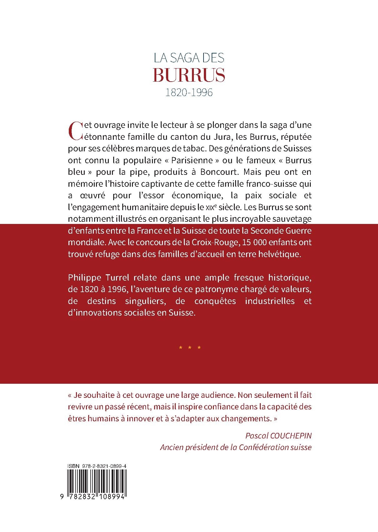 Cet ouvrage invite le lecteur à se plonger dans la saga d’une étonnante famille du canton du Jura, les Burrus, réputée pour ses célèbres marques de tabac. Des générations de Suisses ont connu la populaire « Parisienne » ou le fameux « Burrus bleu » pour la pipe, produits à Boncourt. Mais peu ont en mémoire l’histoire captivante de cette famille franco-suisse qui a oeuvré pour l’essor économique, la paix sociale et l’engagement humanitaire depuis le XIXe siècle. Les Burrus se sont notamment illustrés en organisant le plus incroyable sauvetage d’enfants entre la France et la Suisse de toute la Seconde Guerre mondiale. Avec le concours de la Croix-Rouge, 15 000 enfants ont trouvé refuge dans des familles d’accueil en terre helvétique.