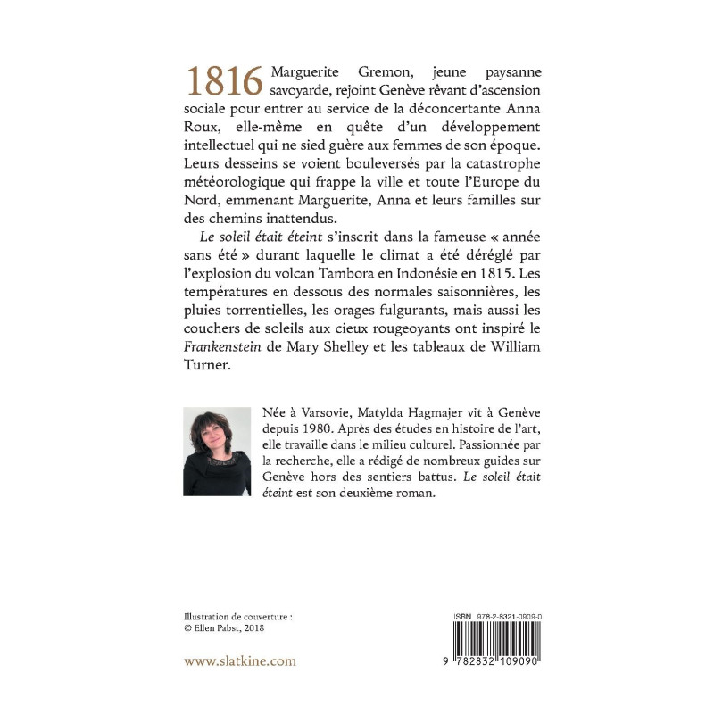 Née à Varsovie, Matylda Hagmajer vit à Genève depuis 1980. Après des études en histoire de l’art, elle travaille dans le milieu culturel. Passionnée par la recherche, elle a rédigé de guides sur Genève hors des sentiers battus. Le soleil était éteint est son deuxième roman.