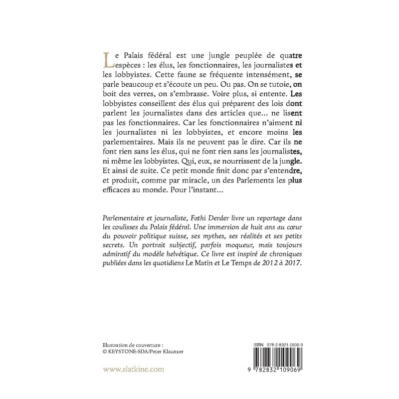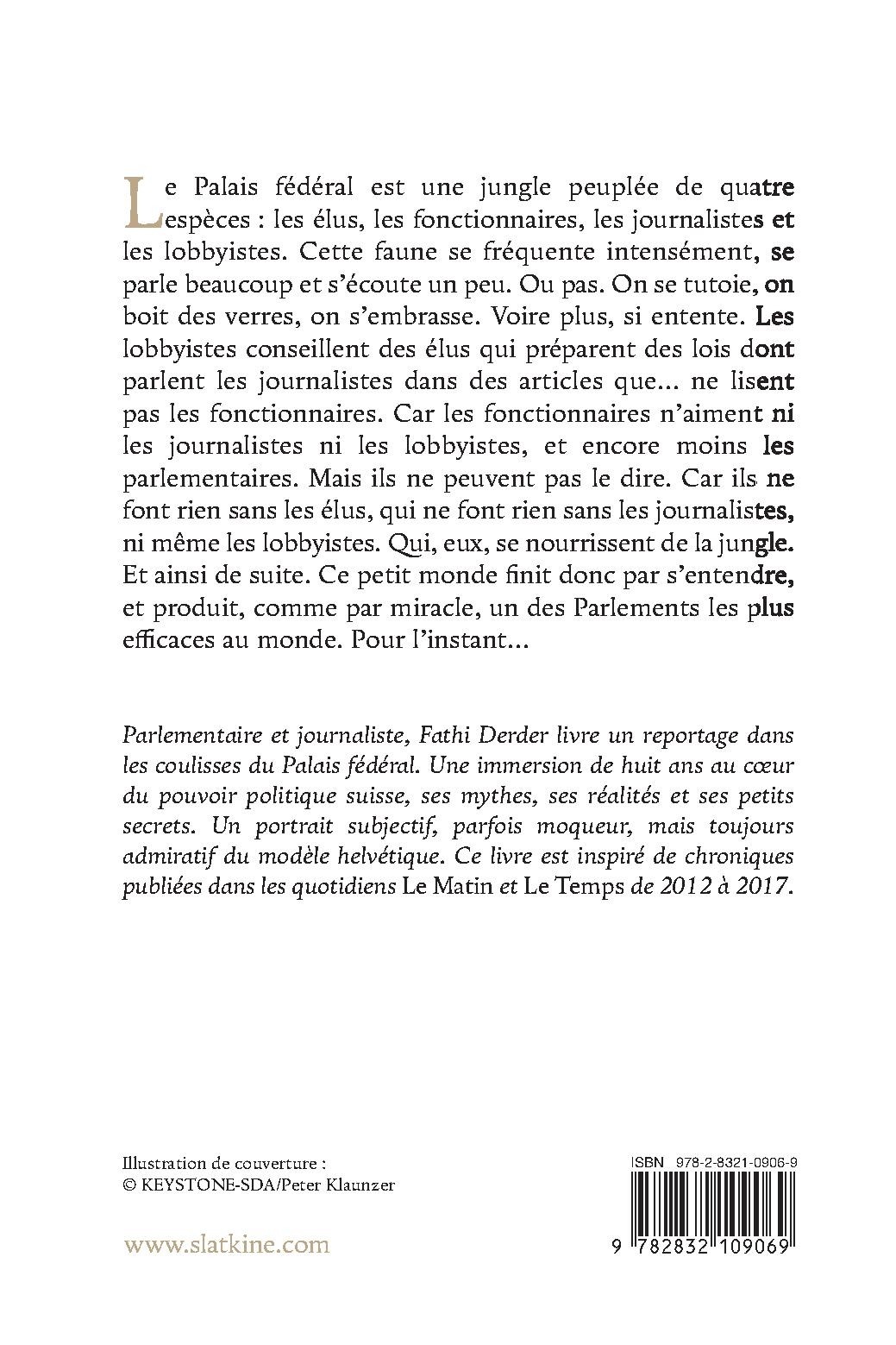 Parlementaire et journaliste, Fathi Derder livre un reportage dans les coulisses du Palais fédéral. Une immersion de huit ans au coeur du pouvoir politique suisse, ses mythes, ses réalités et ses petits secrets. Un portrait subjectif, parfois moqueur, mais toujours admiratif du modèle helvétique. Ce livre est inspiré de chroniques publiées dans les quotidiens Le Matin et Le Temps de 2012 à 2017.