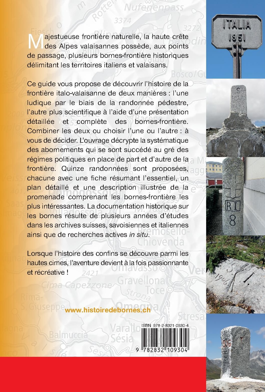 Ce guide vous propose de découvrir l’histoire de la frontière italo-valaisanne de deux manières : l’une ludique par le biais de la randonnée pédestre, l’autre plus scientifique à l’aide d’une présentation détaillée et complète des bornes-frontière. Combiner les deux ou choisir l’une ou l’autre : à vous de décider. L’ouvrage décrypte la systématique des abornements qui se sont succédé au gré des régimes politiques en place de part et d’autre de la frontière. Quinze randonnées sont proposées, chacune avec une fiche résumant l’essentiel, un plan détaillé et une description illustrée de la promenade comprenant les bornes-frontière les plus intéressantes. La documentation historique sur les bornes résulte de plusieurs années d’études dans les archives suisses, savoisiennes et italiennes ainsi que de recherches actives in situ.