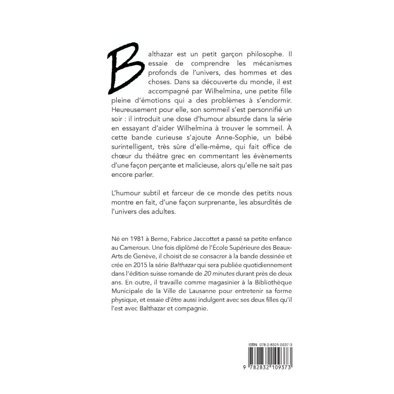 Né en 1981 à Berne, Fabrice Jaccottet a passé sa petite enfance au Cameroun. Une fois diplômé de l’École Supérieure des Beaux-Arts de Genève, il choisit de se consacrer à la bande dessinée et crée en 2015 la série Balthazar qui sera publiée quotidiennement dans l’édition suisse romande de 20 Minutes durant près de deux ans. En outre, il travaille comme magasinier à la Bibliothèque Municipale de la Ville de Lausanne pour entretenir sa forme physique, et essaie d’être aussi indulgent avec ses deux filles qu’il l’est avec Balthazar et compagnie.
