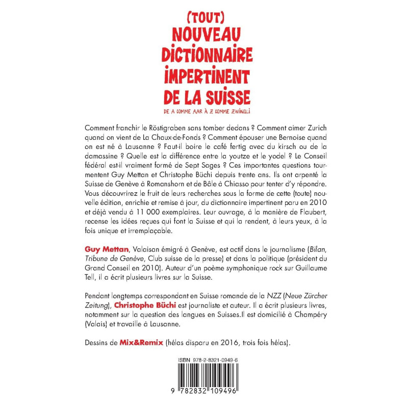 Comment franchir le Röstigraben sans tomber dedans ? Comment aimer Zurich quand on vient de La Chaux-de-Fonds ? Comment épouser une Bernoise quand on est né à Lausanne ? Faut-il boire le café fertig avec du kirsch ou de la damassine ? Quelle est la différence entre la youtze et le yodel ? Le Conseil fédéral est-il vraiment formé de Sept Sages ? Ces importantes questions tourmentent Guy Mettan et Christophe Büchi depuis trente ans. Ils ont arpenté la Suisse de Genève à Romanshorn et de Bâle à Chiasso pour tenter d’y répondre. Vous découvrirez le fruit de leurs recherches sous la forme de cette (toute) nouvelle édition, enrichie et remise à jour, du dictionnaire impertinent paru en 2010 et déjà vendu à 11 000 exemplaires. Leur ouvrage, à la manière de Flaubert, recense les idées reçues qui font la Suisse et qui la rendent, à leurs yeux, à la fois unique et irremplaçable.