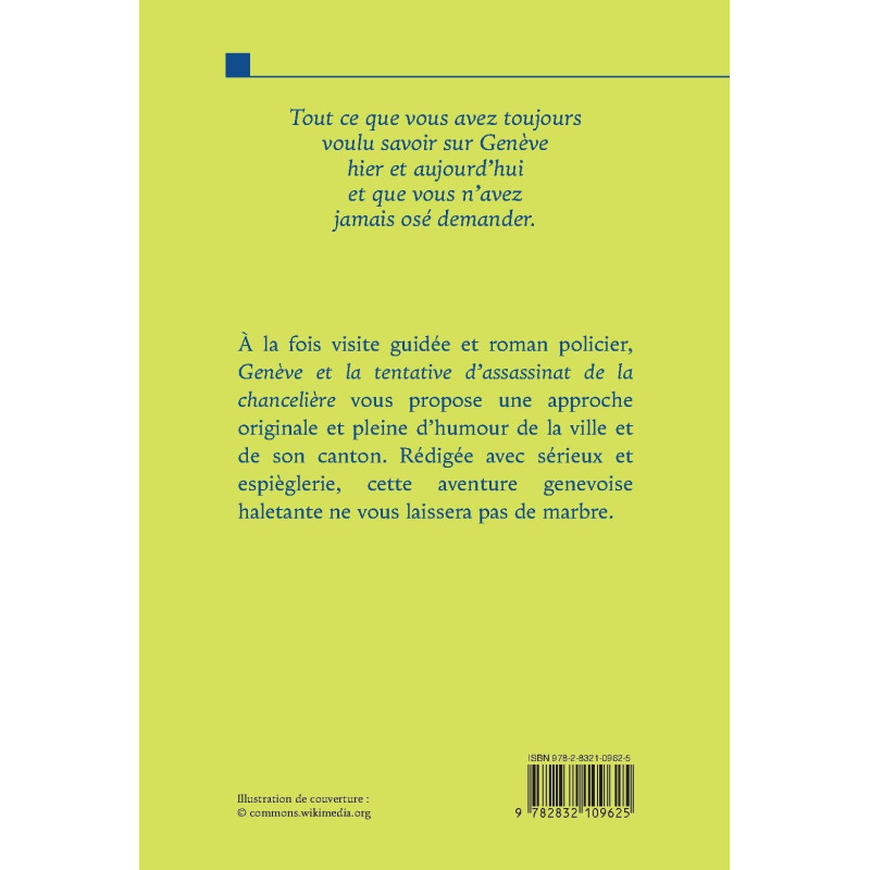 À la fois visite guidée et roman policier, Genève et la tentative d’assassinat de la chancelière vous propose une approche originale et pleine d’humour de la ville et de son canton. Rédigée avec sérieux et espièglerie, cette aventure genevoise haletante ne vous laissera pas de marbre.