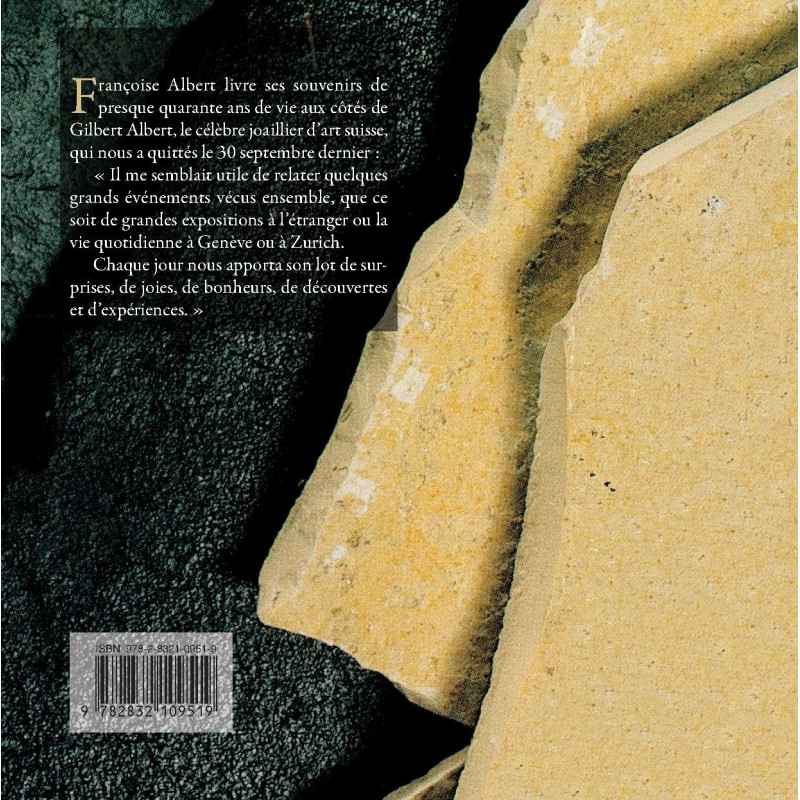 Françoise Albert livre ses souvenirs de presque quarante ans de vie aux côtés de Gilbert Albert, le célèbre joaillier d’art suisse, qui nous a quittés le 30 septembre dernier : « Il me semblait utile de relater quelques grands événements vécus ensemble, que ce soit de grandes expositions à l’étranger ou la vie quotidienne à Genève ou à Zurich. Chaque jour nous apporta son lot de surprises, de joies, de bonheurs, de découvertes et d’expériences. »