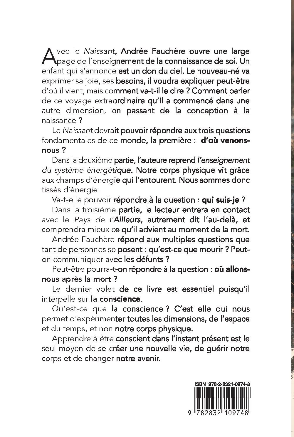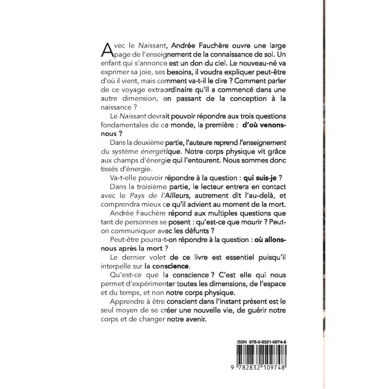 Avec le Naissant, Andrée Fauchère ouvre une large page de l’enseignement de la connaissance de soi. Un enfant qui s’annonce est un don du ciel. Le nouveau-né va exprimer sa joie, ses besoins, il voudra expliquer peut-être d’où il vient, mais comment va-t-il le dire ? Comment parler de ce voyage extraordinaire qu’il a commencé dans une autre dimension, en passant de la conception à la naissance ?