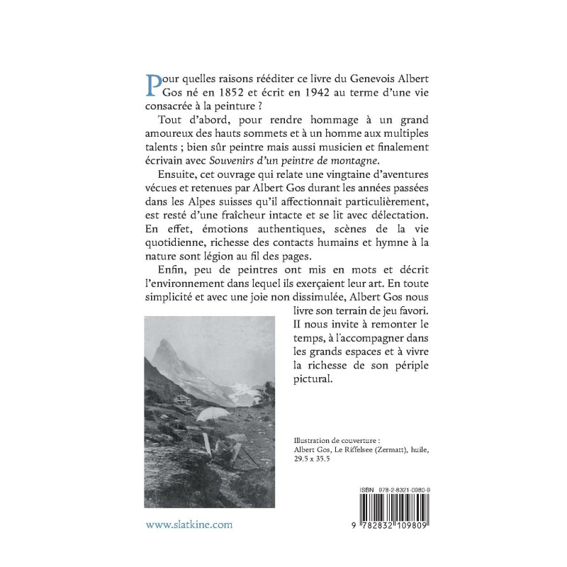 Pour quelles raisons rééditer ce livre du Genevois Albert Gos né en 1852 et écrit en 1942 au terme d’une vie consacrée à la peinture ?