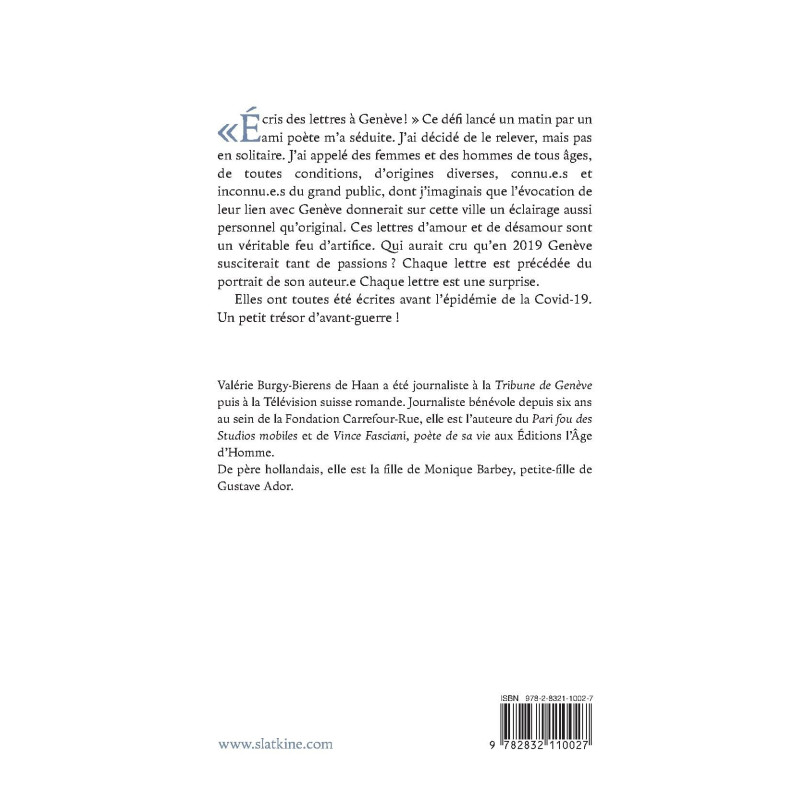 «Écris des lettres à Genève ! » Ce défi lancé un matin par un ami poète m’a séduite. J’ai décidé de le relever, mais pas en solitaire. J’ai appelé des femmes et des hommes de tous âges, de toutes conditions, d’origines diverses, connu.e.s et inconnu.e.s du grand public, dont j’imaginais que l’évocation de leur lien avec Genève donnerait sur cette ville un éclairage aussi personnel qu’original. Ces lettres d’amour et de désamour sont un véritable feu d’artifice. Qui aurait cru qu’en 2019 Genève susciterait tant de passions ? Chaque lettre est précédée du portrait de son auteur.e Chaque lettre est une surprise. Elles ont toutes été écrites avant l’épidémie de la Covid-19.